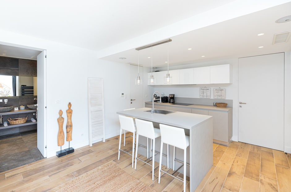 Les espaces de vie – vastes salons, salle à manger intérieure et cuisine équipée – sont conçus pour favoriser la convivialité tout en conservant l’élégance d’une résidence haut de gamme. Le tout s’ouvre sur une grande terrasse offrant une vue panoramique sur la forêt environnante.
